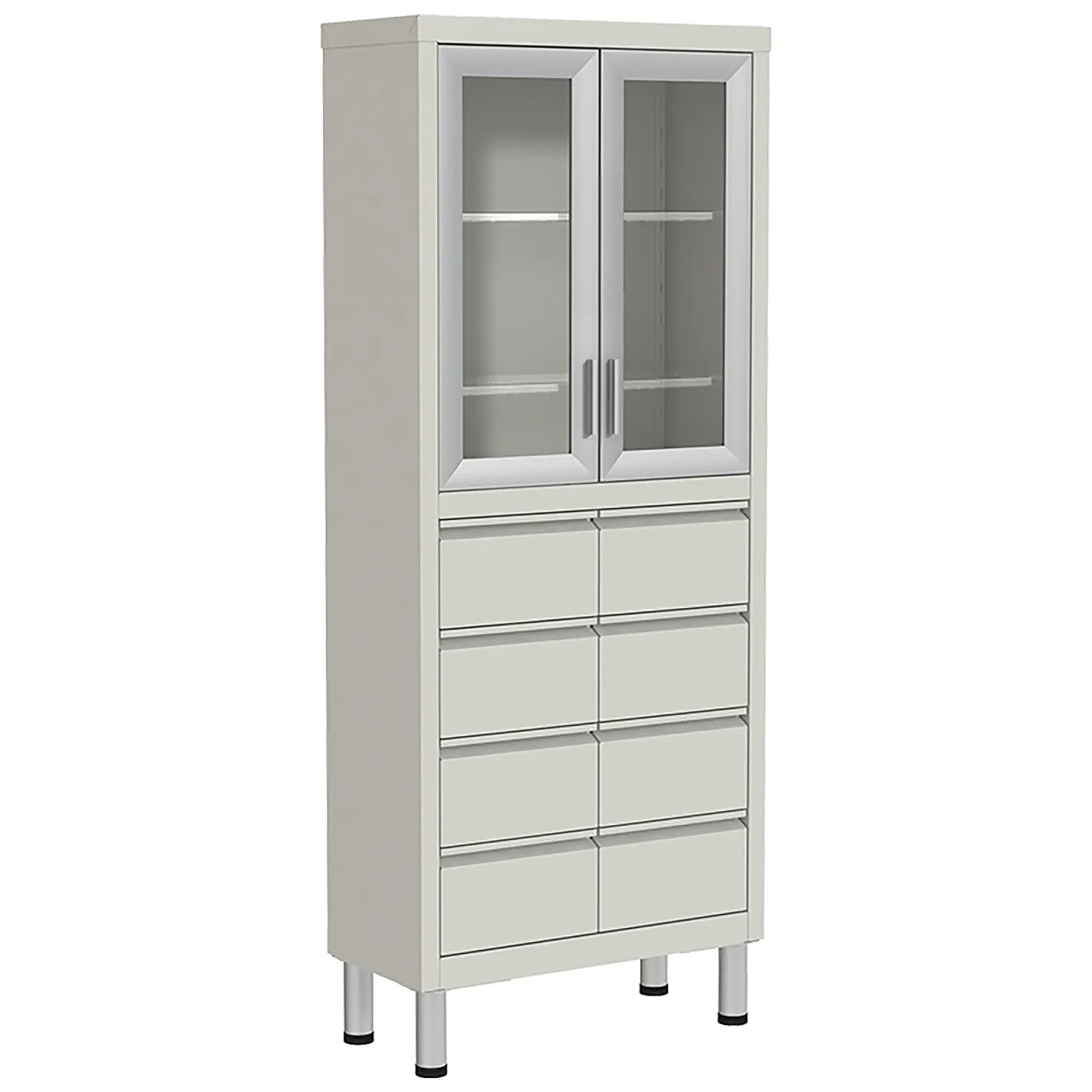 • верхняя секция имеет стеклянные двери в раме из алюминиевого профиля, укомплектованные магнитными защёлками и мебельными ручками. Оси двери вставляются в отверстия в горизонтальных коробах при сборке шкафа, а наличие втулок из ПВХ исключает люфт и смягчают работу двери. Две стеклянные полки устанавливаются на удобную для эксплуатации высоту;