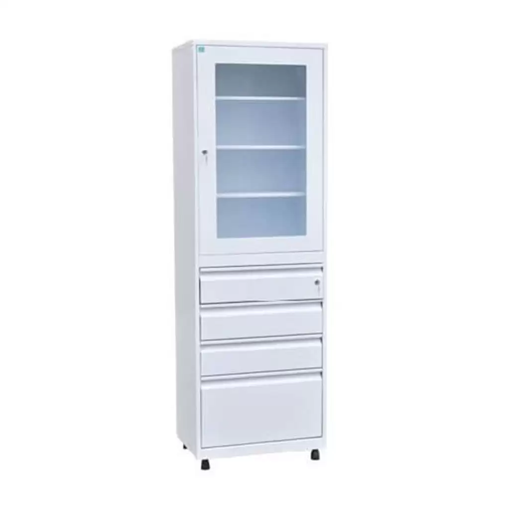 - в верхней части шкафа находится стеклянная дверь в металлической окантовке, за дверью находятся 3 металлические полки;