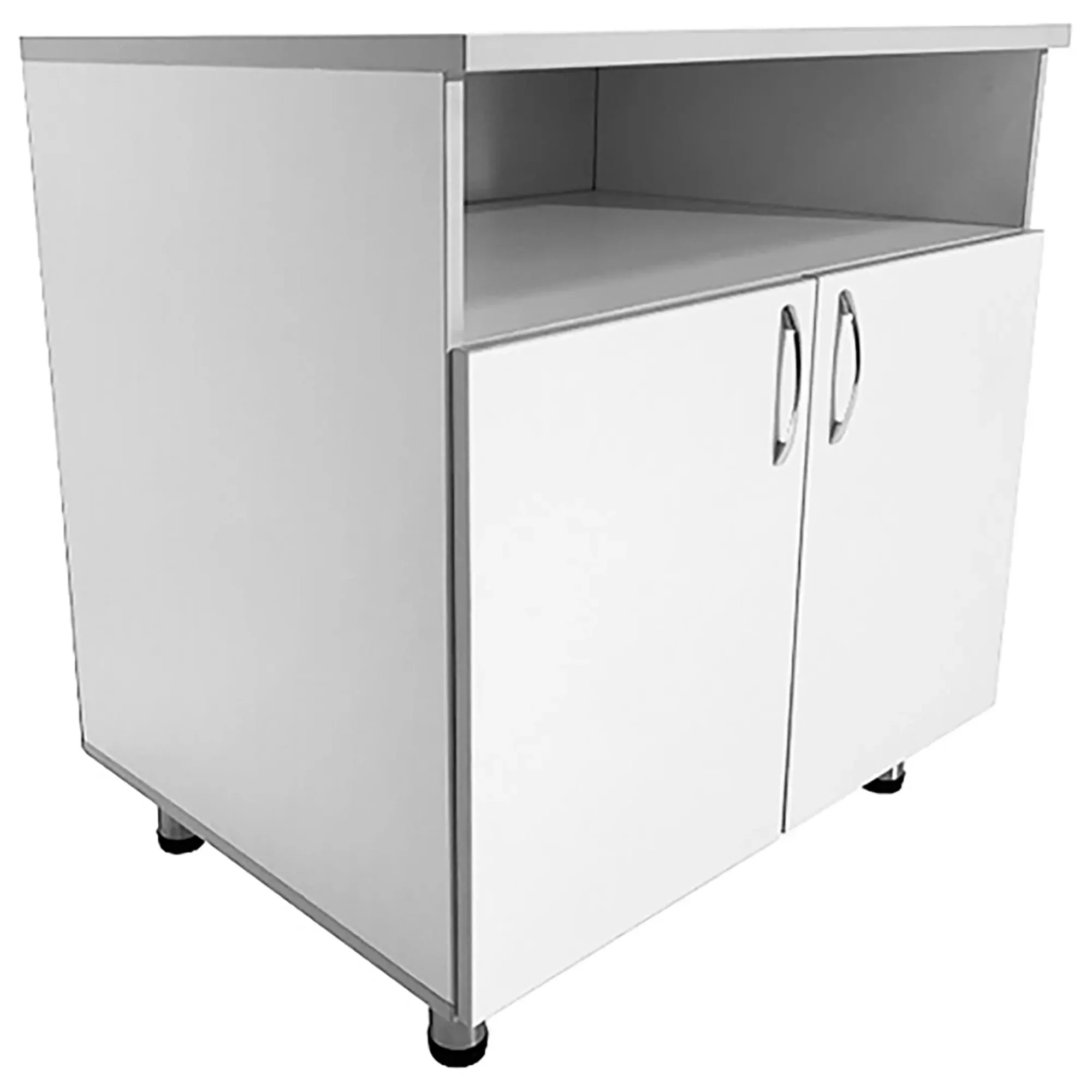 - Многофункциональное пространство для хранения: Под столешницей тумбы расположены большая ниша и вместительное отделение с двумя распашными дверками и полкой внутри. Это позволяет удобно организовать хранение различной медицинской аппаратуры и предметов.