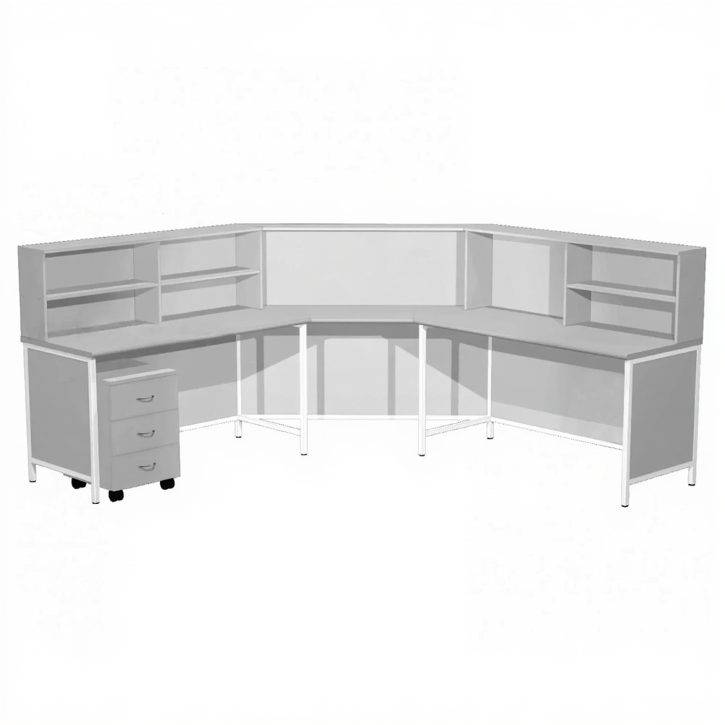 Стол-барьер рабочий на металлокаркасе ПМ-4 (ЛДСП серый, каркас белый) — это специализированная угловая мебель для оснащения рабочего места дежурной медсестры, осуществляющей круглосуточный уход за больными, контроль состояния их здоровья, оказание первой и неотложной помощи, а также проведение планового медикаментозного лечения. Модель состоит из левого стола, правого стола и углового столика с надстройками.