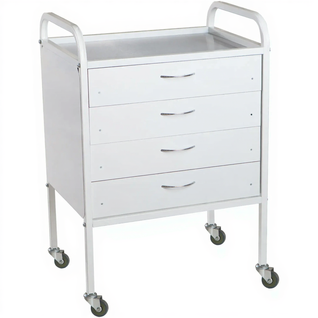 Столик медицинский инструментальный СМИ-01-04 (полки металл) — это передвижная тумба, предназначенная для размещения инструмента, лекарственных препаратов и приборов в медицинских учреждениях и лабораториях. Модель имеет каркас из профильной стальной трубы, четыре выдвижных ящика и верхнюю полку из металла.