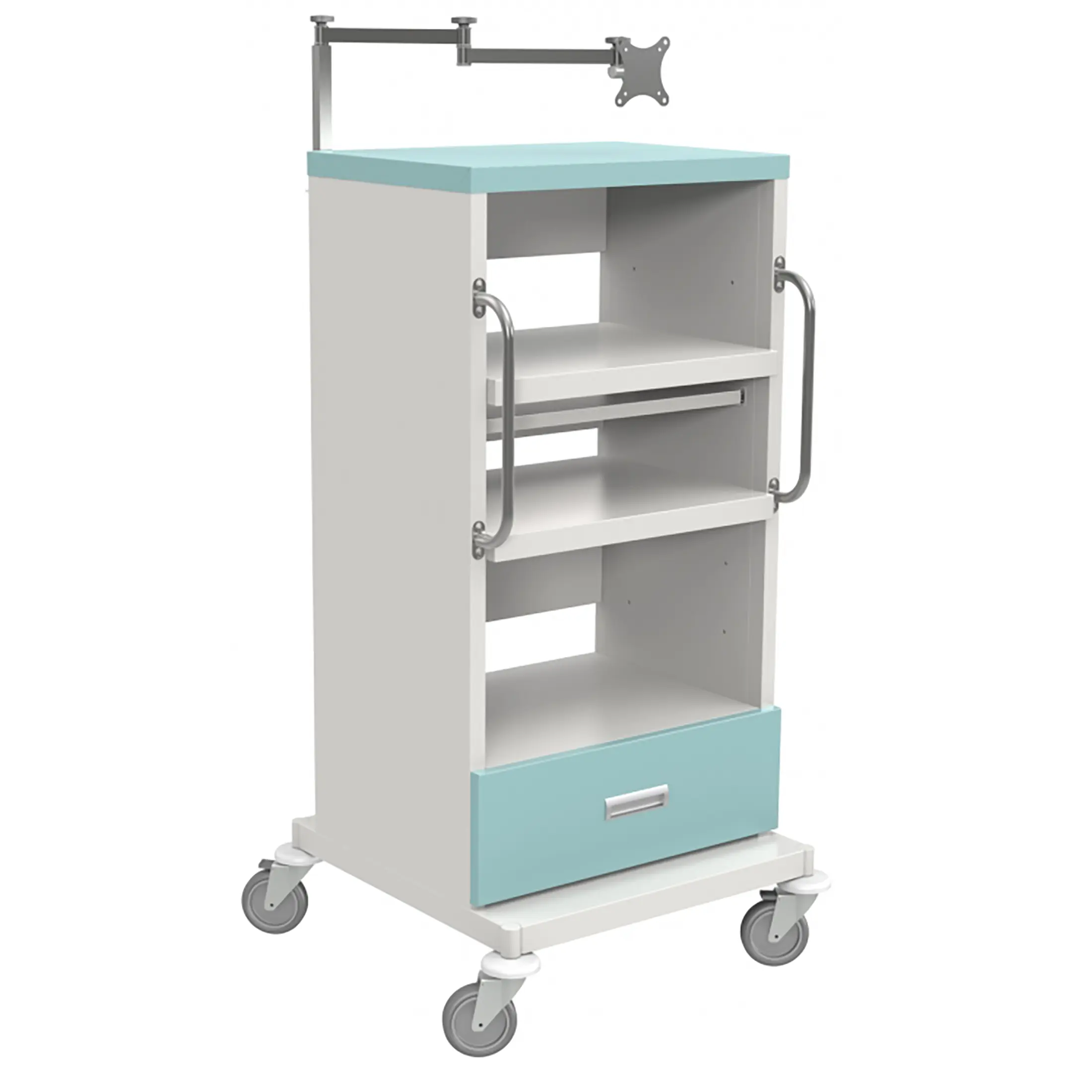 • верхняя часть оснащена креплением для монитора, телескопическое устройство которого позволяет регулировать высоту крепления и положение монитора в пространстве;