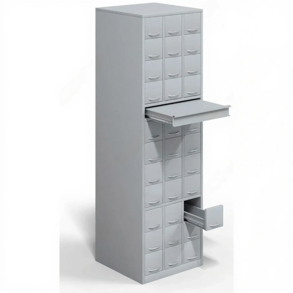 - 33 выдвижных ячейки — достаточная вместимость для хранения библиотечных карточек.
