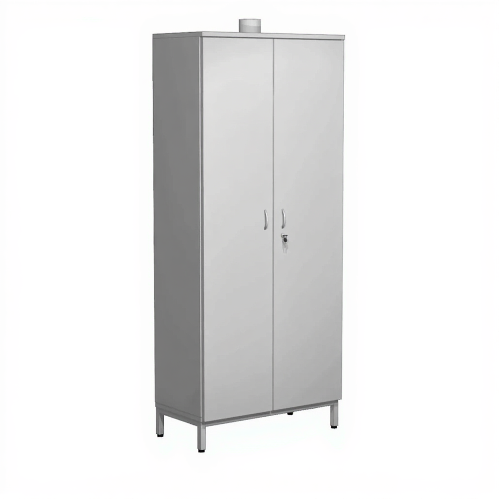 - Безопасное хранение — фланец для подключения к вытяжной вентиляции и вентиляционный канал обеспечивают удаление едких паров и защиту от их скопления.