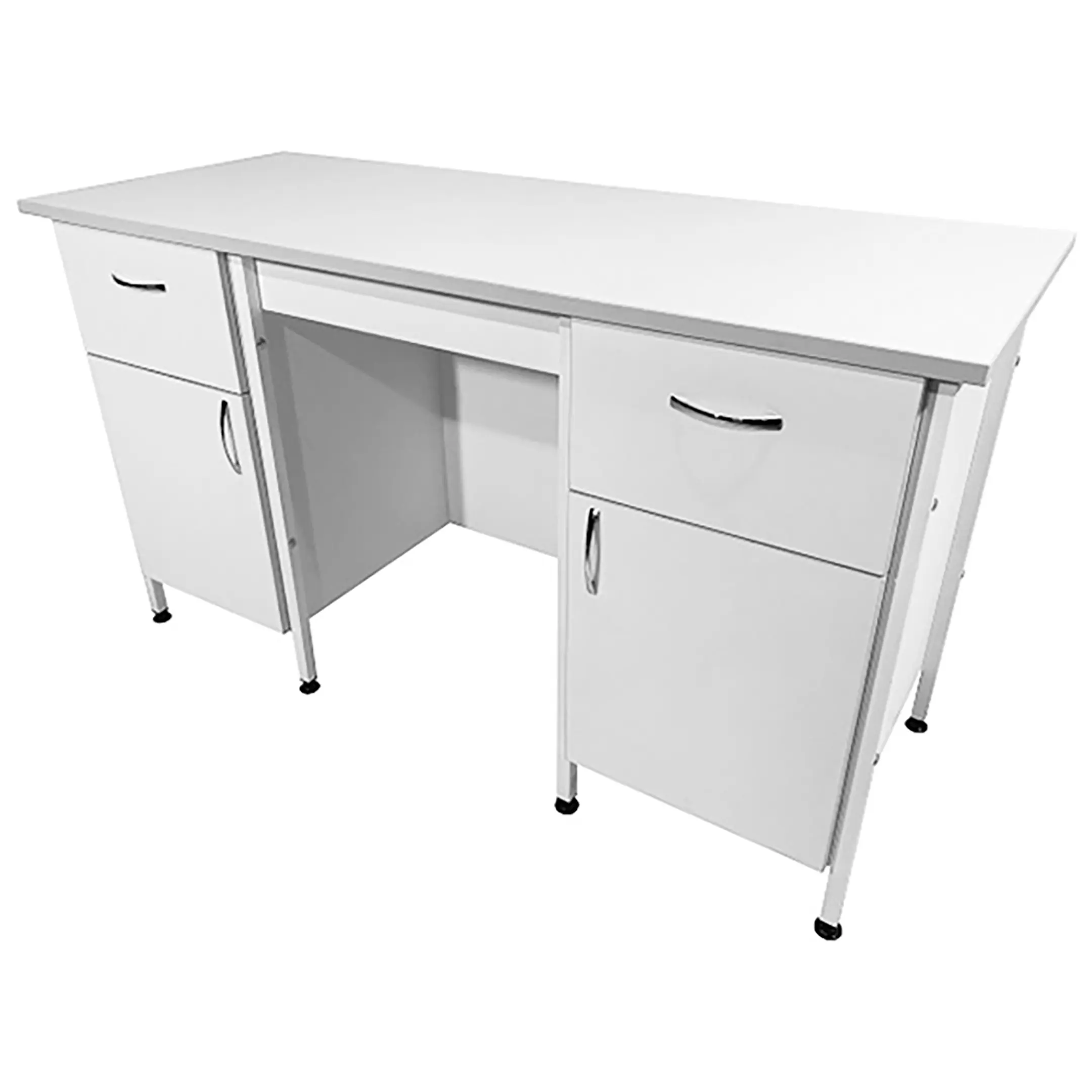 Стол лабораторный СЛ 12.017 (белый) — это функциональное и элегантное решение для создания эффективного рабочего пространства не только в лабораториях, но и в медицинских учреждениях. Модель оснащена двумя тумбами с выдвижными ящиками, полками и распашными дверками. Каркас выполнен из стального профиля, столешница из ЛДСП толщиной 22 мм.