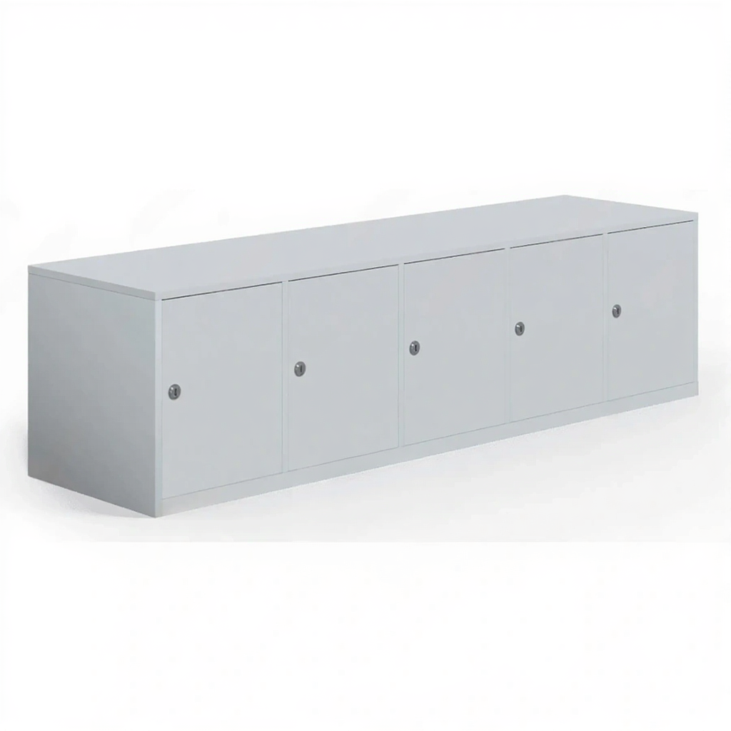 - Индивидуальные места для хранения — 5 отдельных вертикальных ячеек предоставляют личное пространство для сумок, сменной обуви, спортивной формы или рабочих принадлежностей для небольшой группы.