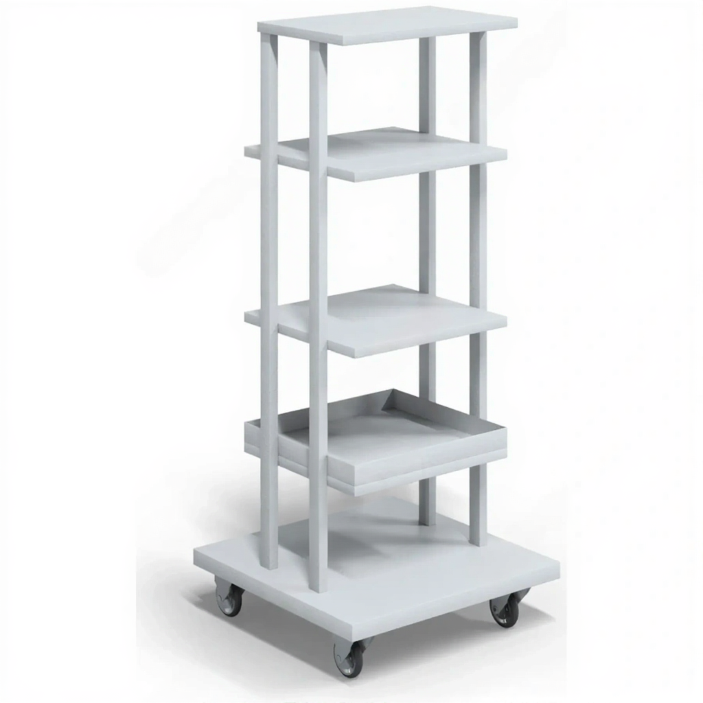 - Полная мобильность и маневренность — оснащена прочными колесами (часто с тормозами), что позволяет легко перевозить даже тяжелое и громоздкое оборудование между кабинетами, залами или этажами.