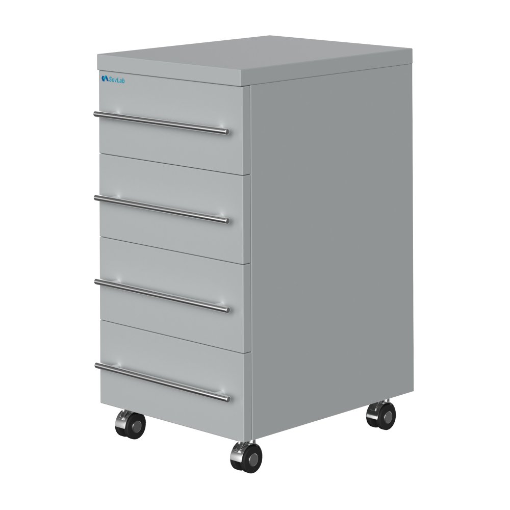 - Мобильность и компактность — колесные опоры диаметром 50 мм позволяют легко перемещать тумбу, оптимальные габариты для размещения в любом месте лаборатории.