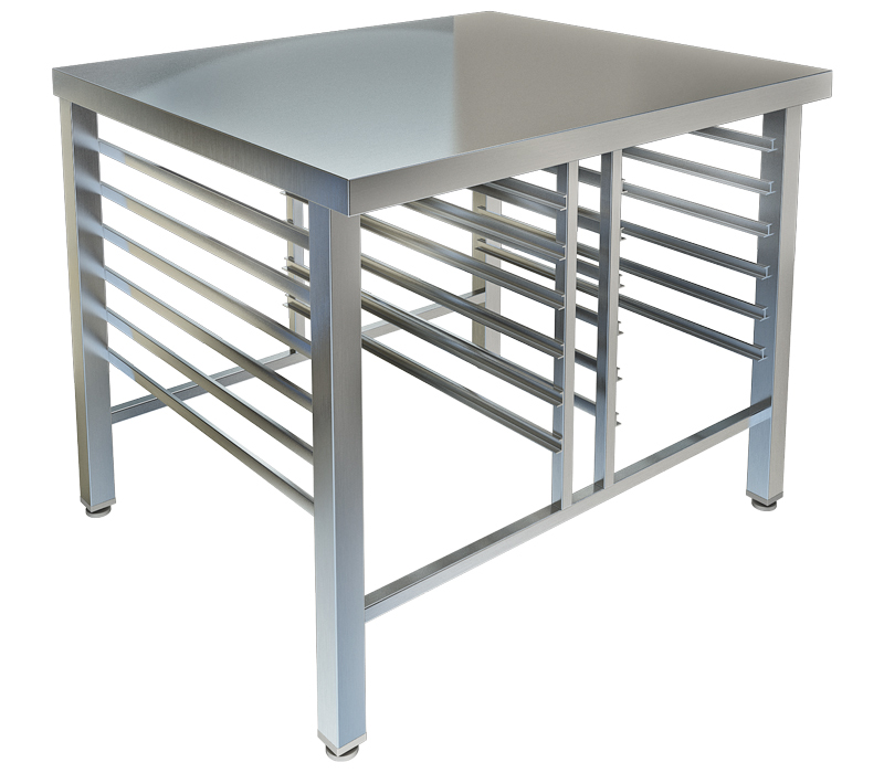 Столешница из листовой стали приваривается к основанию из квадратного металлического профиля. Под рабочей поверхностью размером 84,5х72,4 см располагается зона для хранения пустых или наполненных полуфабрикатами противней. Предусмотрено две секции размещения, каждая рассчитана на семь уровней GN 1/1.