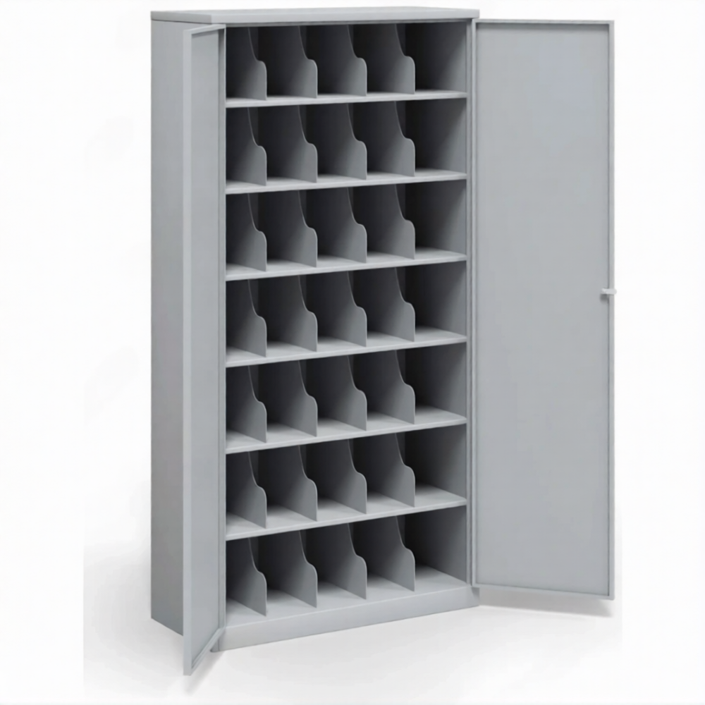 - 35 ячеек, две дверцы, скошенные полки для удобства хранения СИЗ.