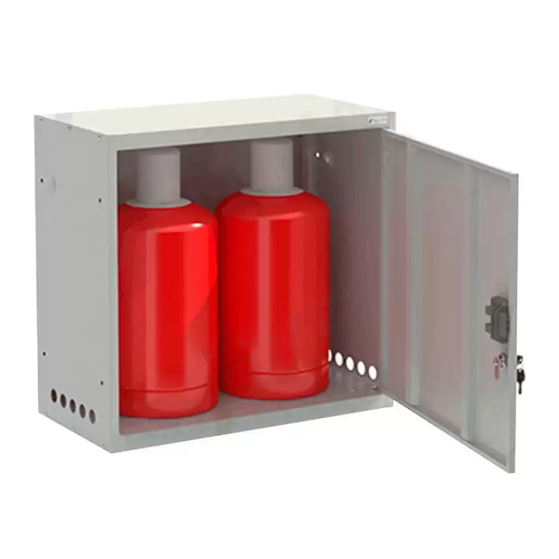 - Прочная и долговечная конструкция — шкаф изготавливается из качественной стали с антикоррозионным покрытием, рассчитан на вес двух полных 27-литровых баллонов и длительную эксплуатацию в условиях производственного помещения или склада.