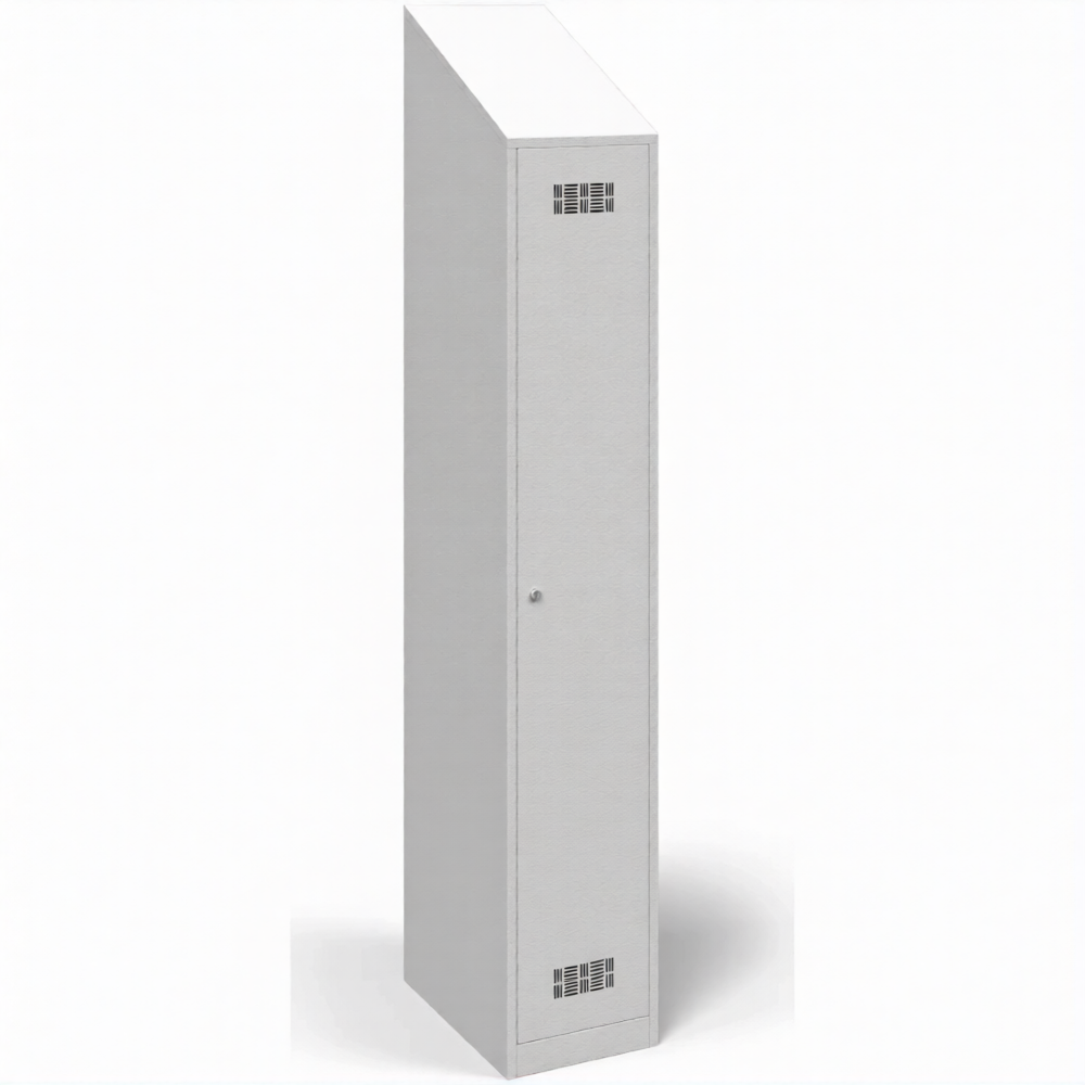 • Шкаф металлический для одежды односекционный с наклонной крышей предназначен для установки в условиях ограниченного пространства.