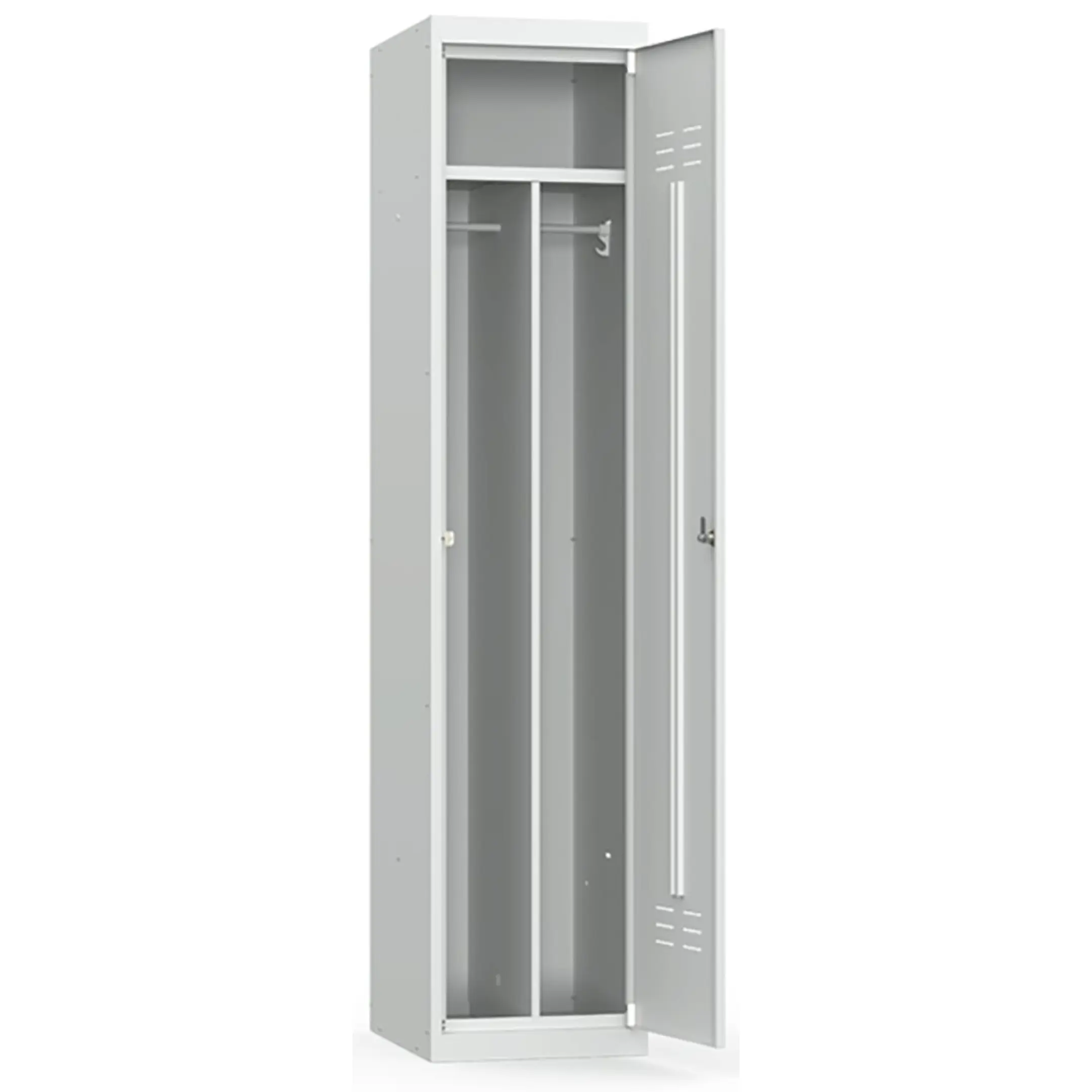 • Особенностью шкафа является внутренняя перегородка, создающая две раздевальные зоны, в каждой из которых имеются металлические перекладины для вешалок, два пластиковых крючка для одежды;