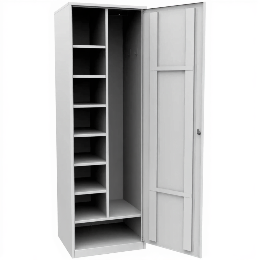 Шкаф хозяйственный ШУН-600-7П — это высокоорганизованное решение для комплексного хранения уборочного инвентаря, моющих средств и различных хозяйственных принадлежностей. Модель с семью полками (7П) обеспечивает максимальную систематизацию содержимого и предназначена для объектов, где требуется детальное разделение различных категорий имущества.