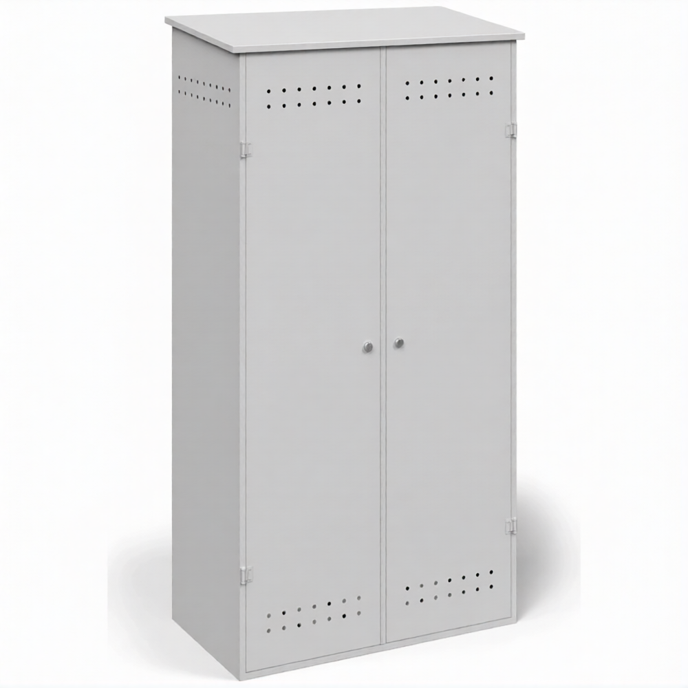 - Обеспечение требований пожарной безопасности — прочный металлический корпус служит эффективным барьером, изолирующим баллоны от возможных источников открытого огня, искр и тепла. Наличие системы приточно-вытяжной вентиляции (перфорация или вентиляционные решетки в верхней и нижней частях) обеспечивает постоянный воздухообмен, что критически важно для предотвращения образования взрывоопасной концентрации газа в случае утечки, в полном соответствии с ППР РФ.