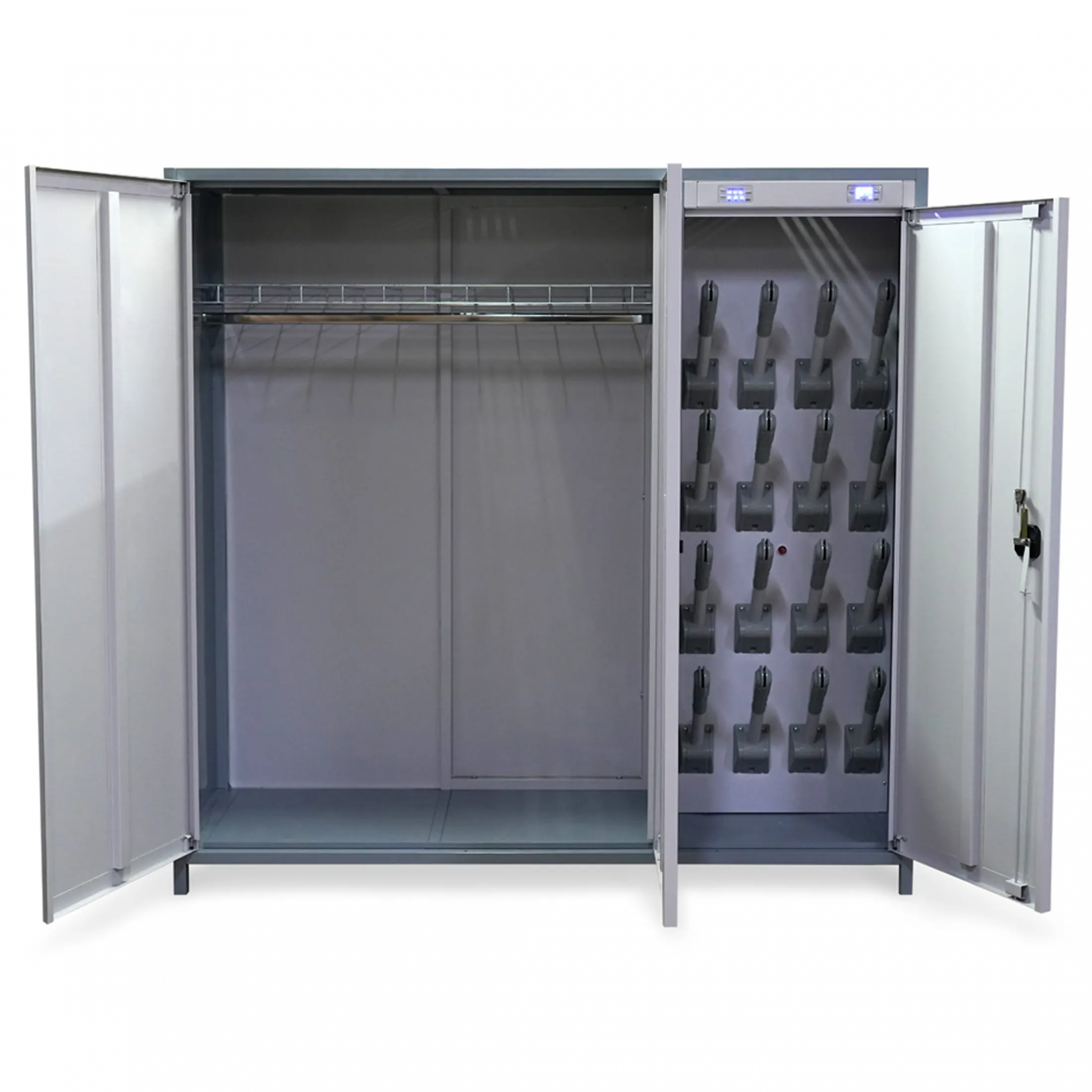 - Высокая производительность и вместимость — шкаф рассчитан на загрузку значительных объемов одежды и обуви за один цикл, что позволяет эффективно обслуживать большие коллективы на предприятиях, в спортивных комплексах или медицинских стационарах.